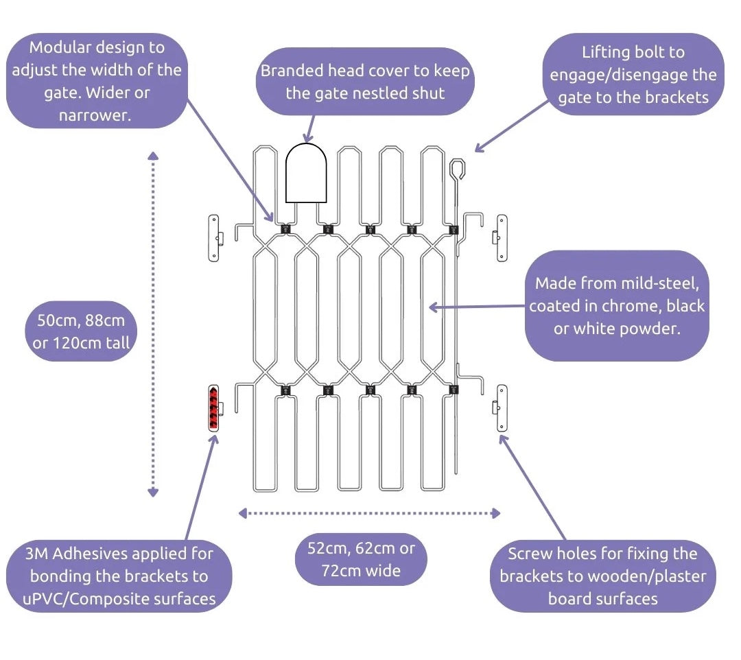 Each DoorGuard™ Pet Gate comes with mounting brackets and your choice of adhesive strips and screws. Choose your preferred installation with or without drilling.